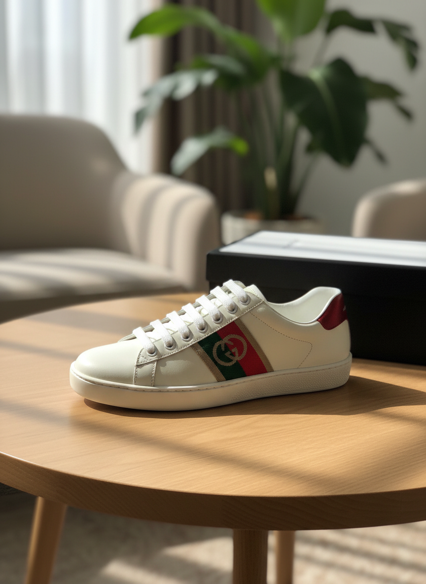 Gucci Ace White Leather Sneakers with signature red-green web and Double G logo, red heel detail, unisex luxury casual shoes, stylish, comfortable, and versatile for everyday wear.