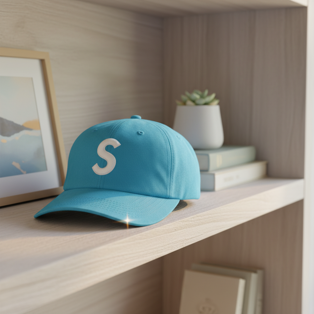 Supreme Bright Blue Cotton Baseball Cap with White Embroidered S Logo, Unisex Streetwear Style, Fashionable and Sun-Protective, Perfect for Everyday Casual Outfit.