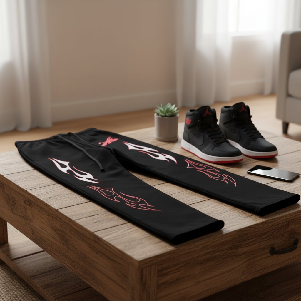 Hellstar Black Flame Totem Casual Pants – soft cotton fabric, red and white flame side design, streetwear style, unisex, perfect for everyday outfits showing attitude and fashion.