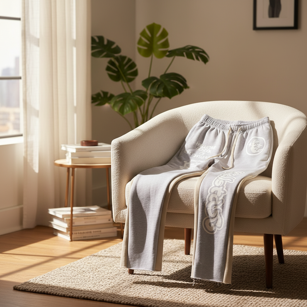 Hellstar gray street casual pants made from premium cotton blend, breathable and comfy. Beige side panels, white embroidered logo, elastic drawstring waist, unisex, perfect for trendy daily wear.