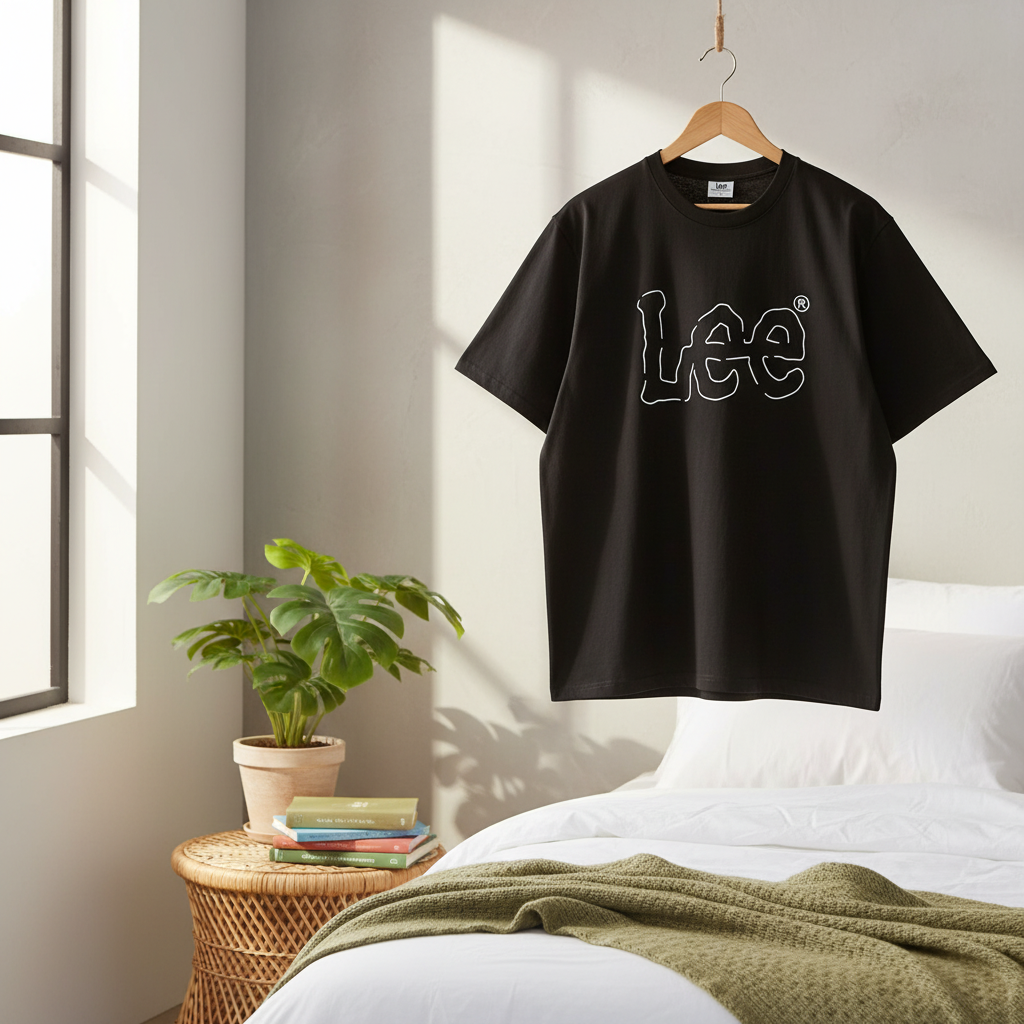 Lee Black Casual T-Shirt, breathable cotton fabric, white handwritten Lee logo on front, round neck loose fit, unisex design, simple stylish look ideal for daily wear and easy to match any outfit.