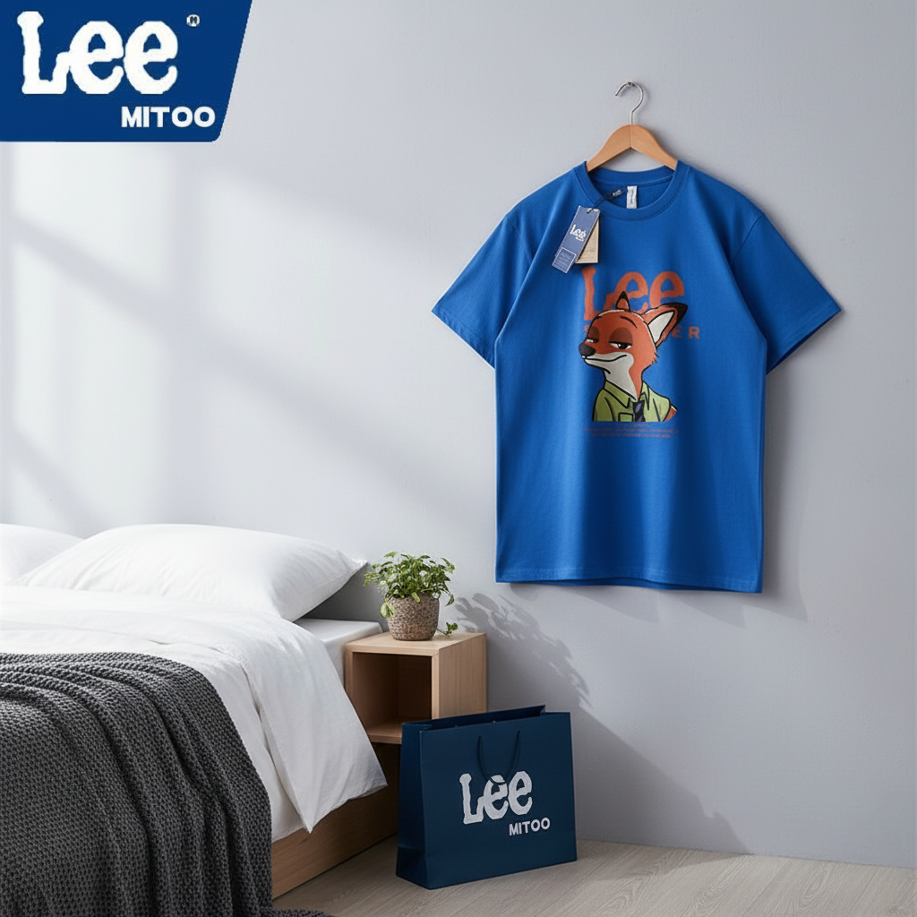 Lee MITOO Series Blue Cotton T-Shirt, soft and breathable, features cartoon Nick print for trendy casual style, unisex design, perfect for daily wear with comfort and personality.