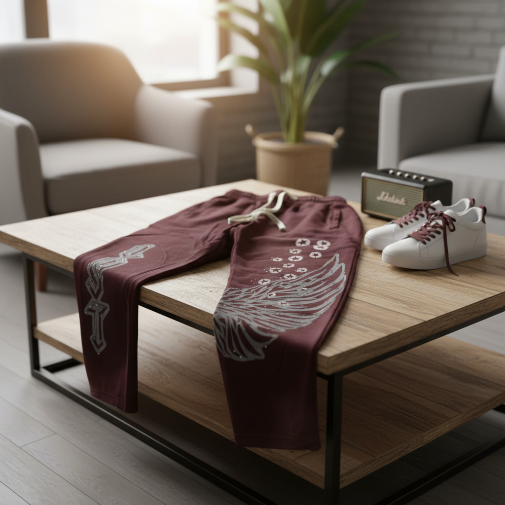 Lostshdws burgundy casual sweatpants, premium cotton fabric, silver letter motif on left leg, wing and star print on right, drawstring elastic waist, unisex streetwear comfort for daily style.