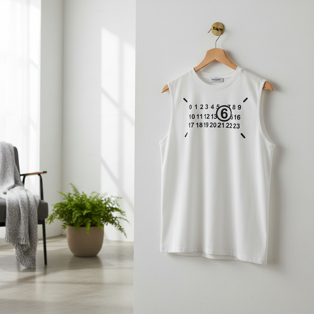 Maison Margiela white sleeveless cotton tank top with signature black numeric print and circle 6 motif. Stylish, unisex, minimalist design for casual wear with avant-garde aesthetic.
