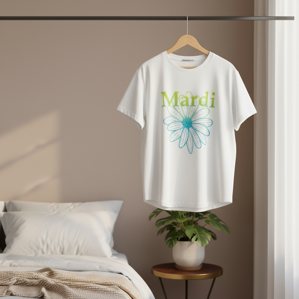 Mardi Mercredi Daisy Print T-Shirt, made of soft breathable cotton, unisex casual style, features brand lettering and daisy motif on chest, simple and trendy for daily wear.