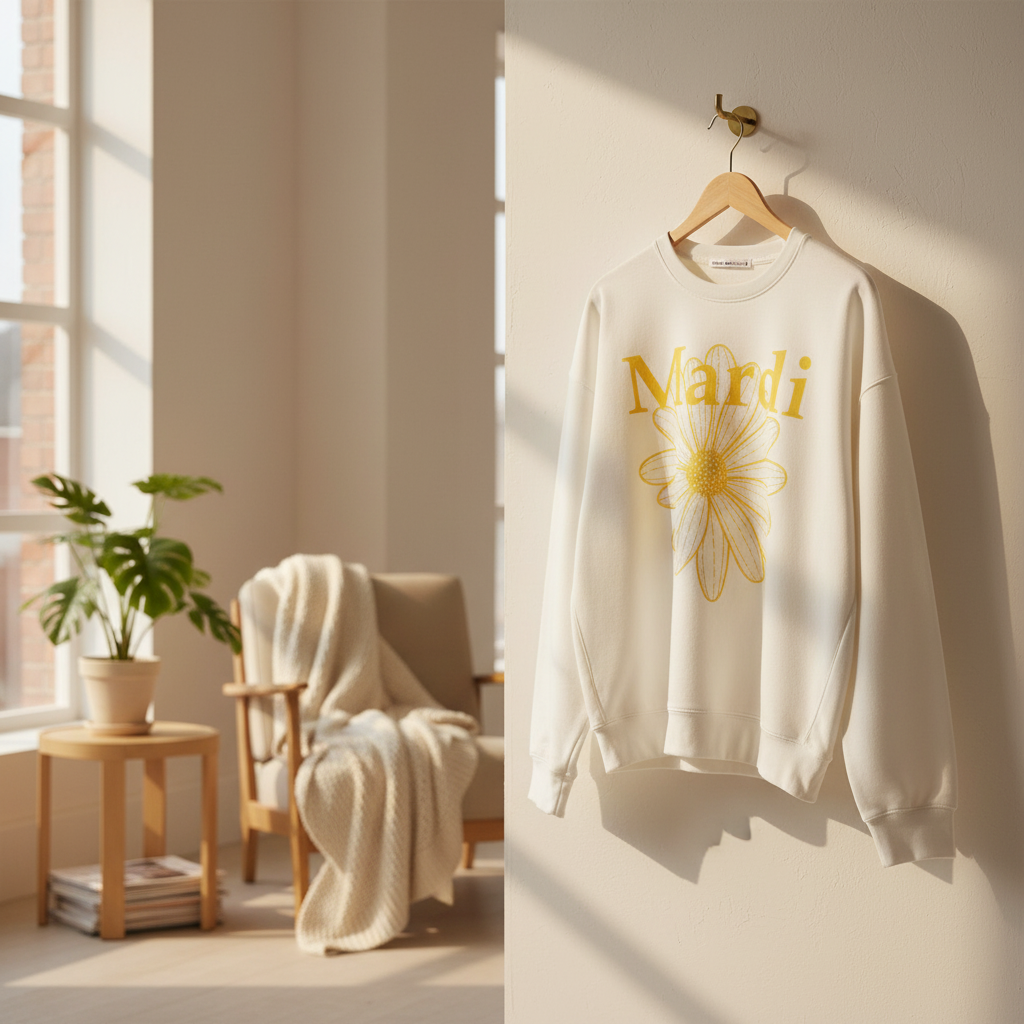 Mardi Mercredi White Daisy Sweatshirt, soft breathable cotton, unisex loose fit for casual style, featuring yellow daisy print and brand logo, perfect for everyday fashionable comfort.
