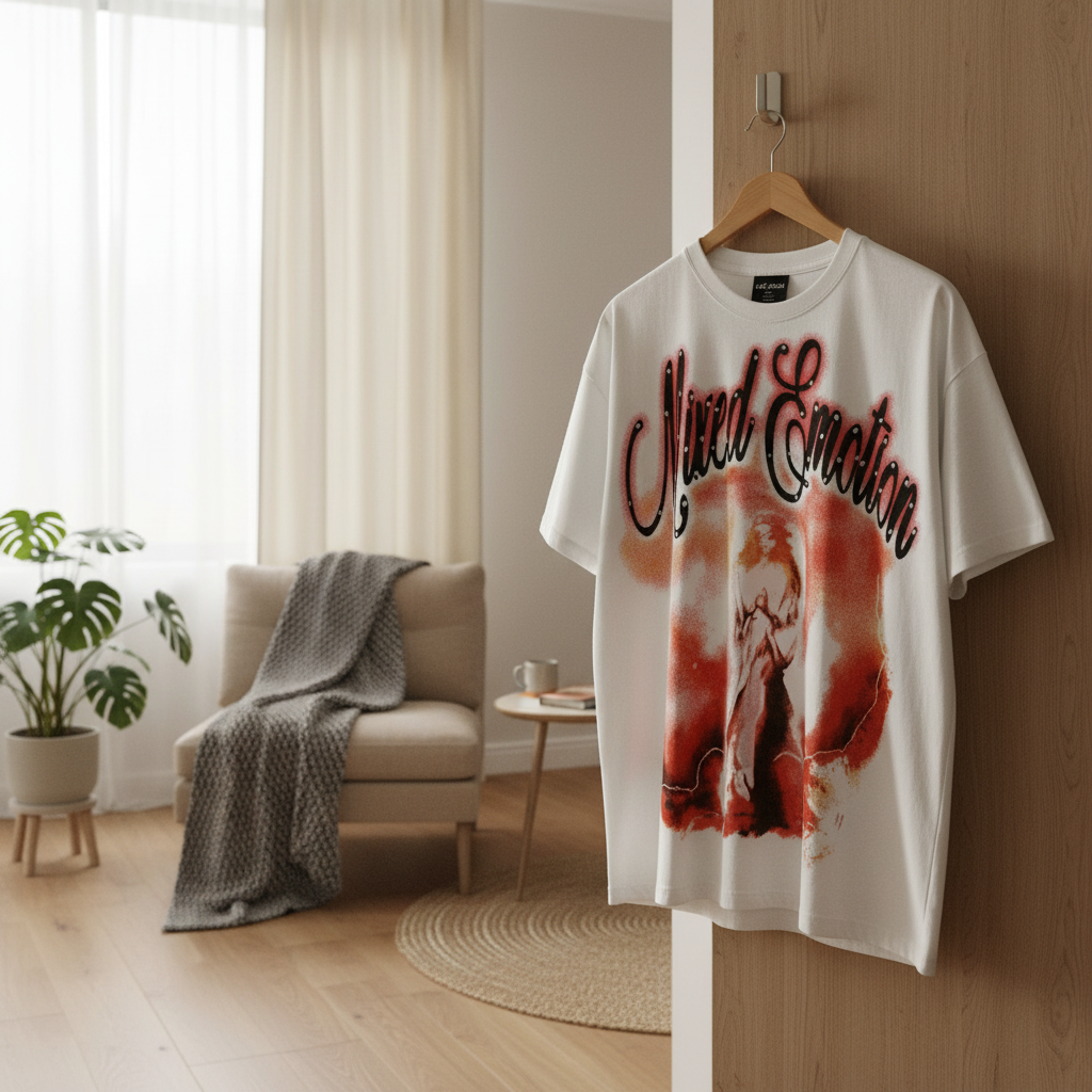 Mixed&emotion white loose fit cotton T-shirt with red graphic and handwritten logo, breathable streetwear style, unisex design for casual daily outfits full of personality.