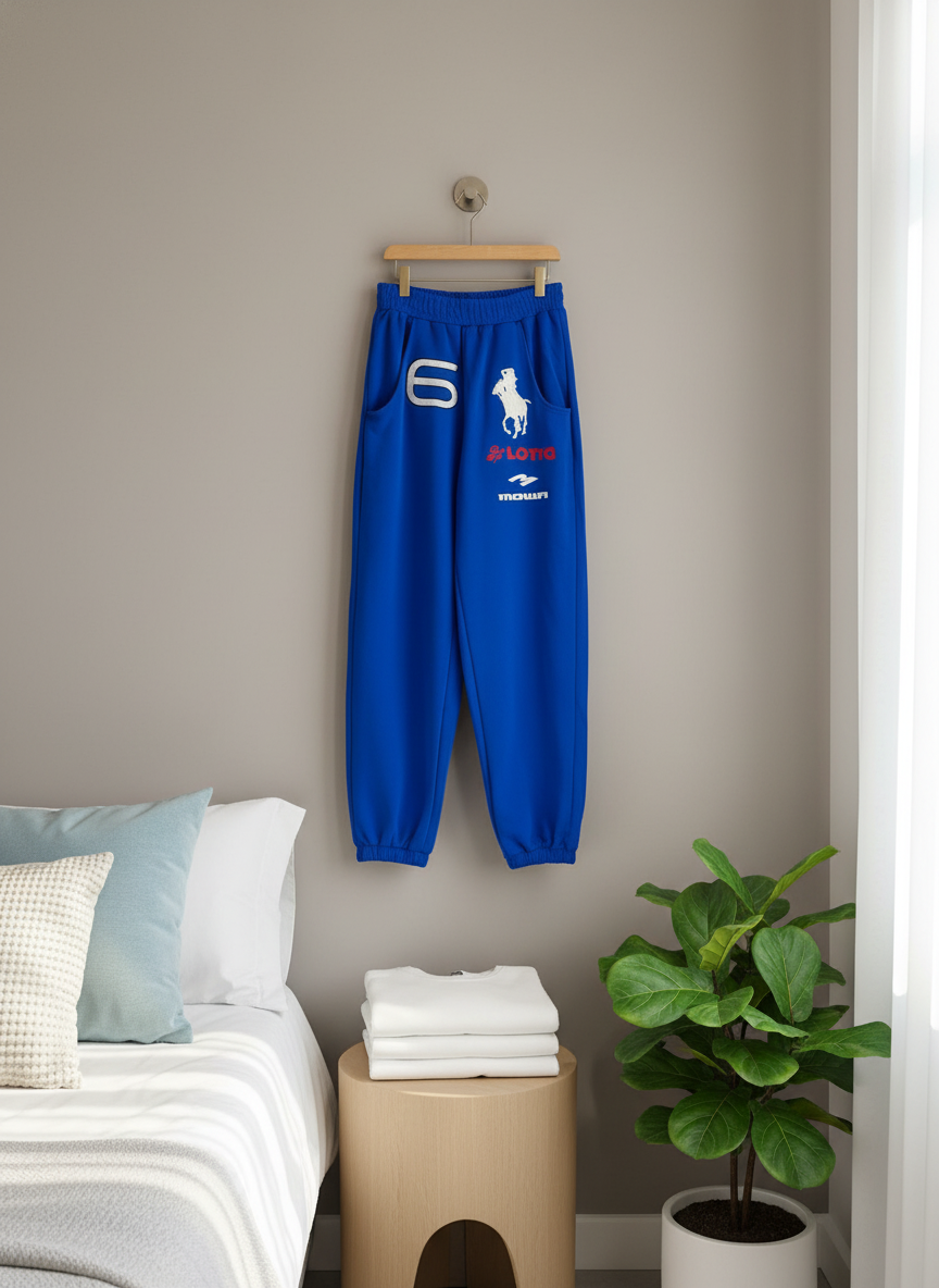 Mowalola Blue Jogger Pants, soft skin-friendly fabric, cuffed design with embroidered number 6, horse motif and Loma logo, unisex streetwear style, perfect for daily casual wear.