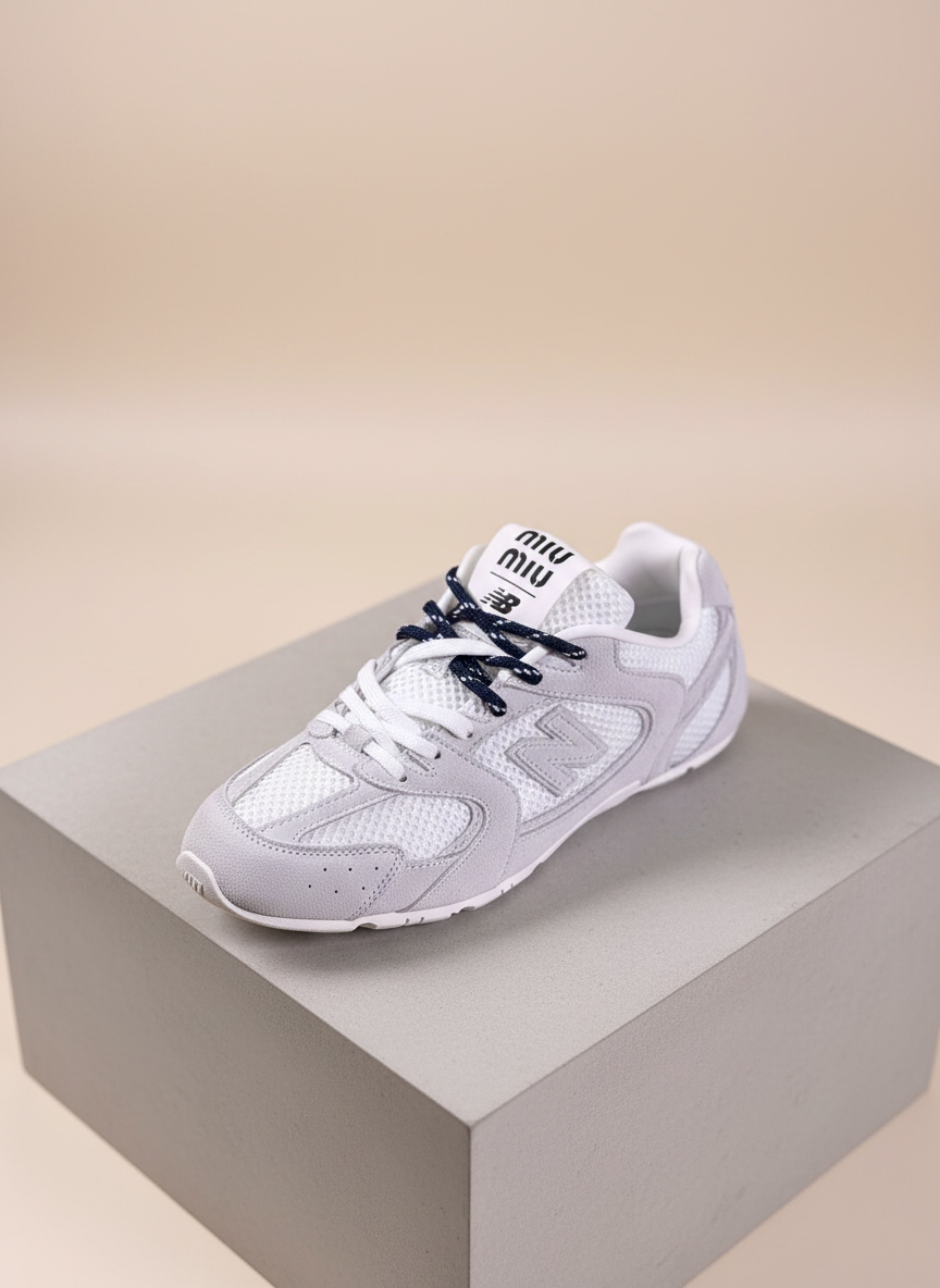 New Balance x Miu Miu white grey sneakers, mesh and suede mix, dual logo tongue, made in Italy craftsmanship, trendy unisex design, stylish, comfortable, and perfect for everyday wear.