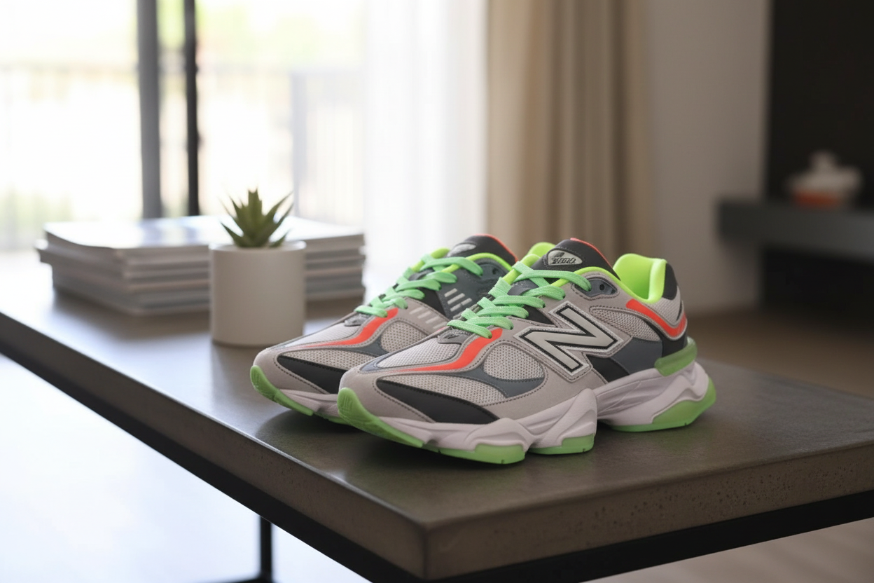 New Balance U9060DGG sneakers in gray, white, neon green, and orange. Retro chunky style with mesh and synthetic leather upper. Unisex, breathable, comfy, and perfect for casual fashion.
