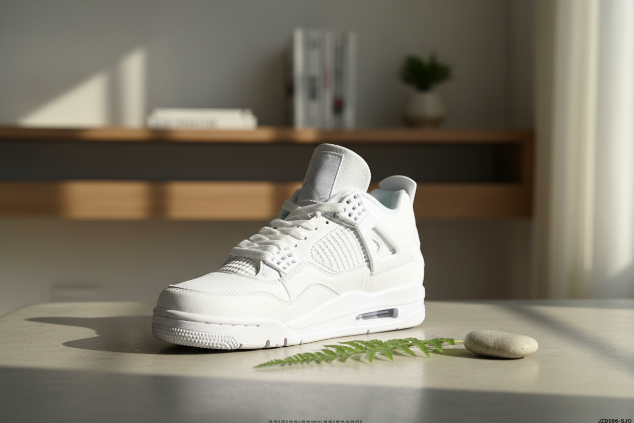 Nike Air Jordan 4 White Sneakers blend leather and mesh with Air cushioning, iconic net panel, and heel logo. Unisex streetwear style offering comfort, fashion, and timeless athletic appeal.