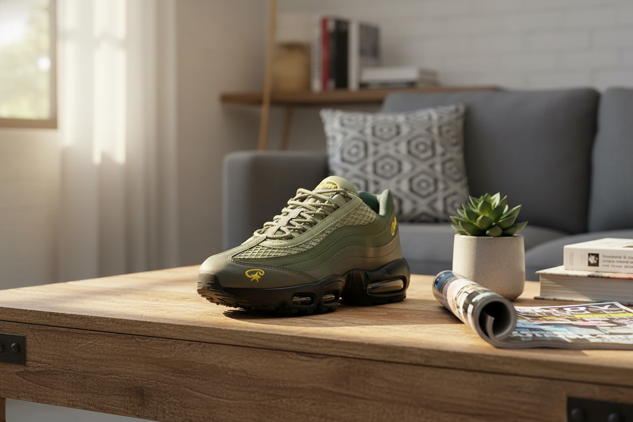 Nike Air Max 95 Olive Green sneakers with mesh and leather panels, iconic Air cushioning, wavy lines and yellow details. Classic 90s street style for men and women, comfort meets performance.