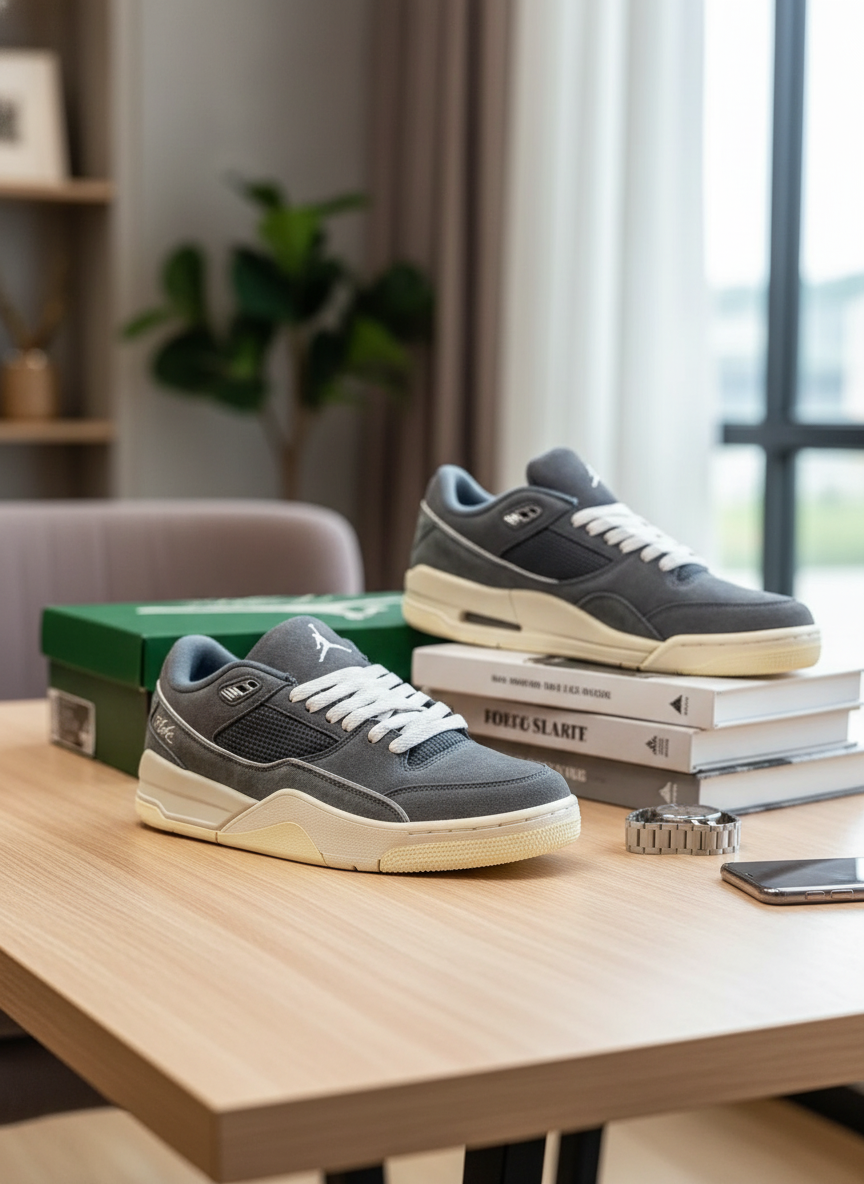 Nike Jordan Grey Suede Mesh Low-Top Sneakers featuring the iconic Jumpman logo. Street-style unisex design, comfortable and versatile for everyday wear and casual sports.