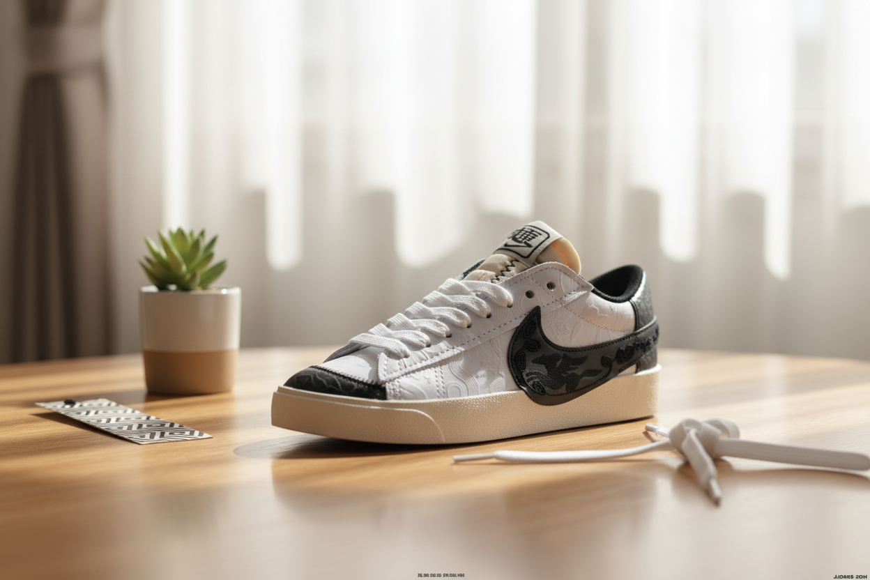 Nike Blazer Black White Sneakers feature embossed fabric, crocodile-texture leather, paisley Swoosh, retro silhouette, unisex design, durable comfort, and trendy street-ready style.
