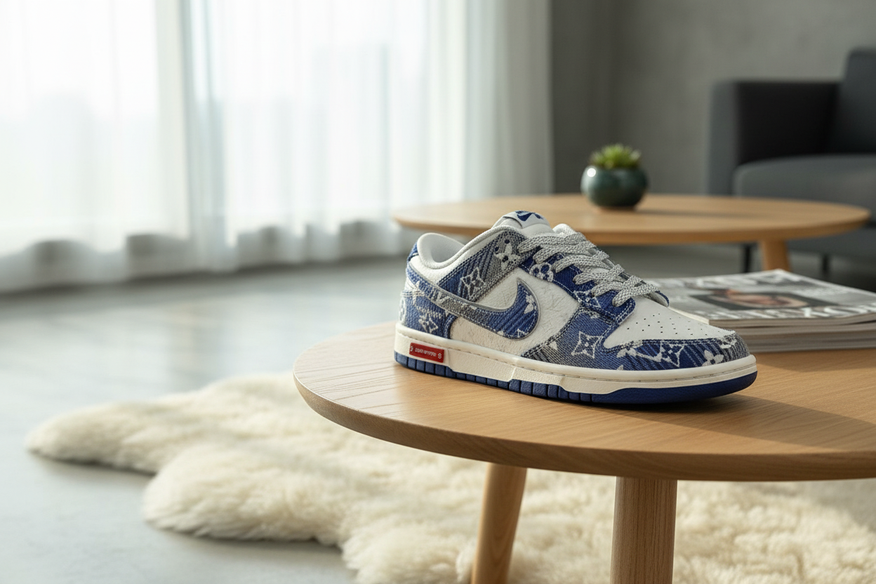 Nike Dunk Low x LV Monogram Blue White Sneakers, crafted from denim and leather panels, unisex trendy design, stylish and comfortable, showcasing bold collab identity with premium detail.