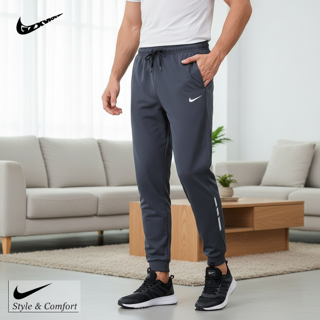 Nike Men’s Grey Jogger Pants, made with dry breathable fabric, drawstring waist, classic Nike logo on side, cuffed design for comfort, perfect for workouts or casual wear with sporty style.