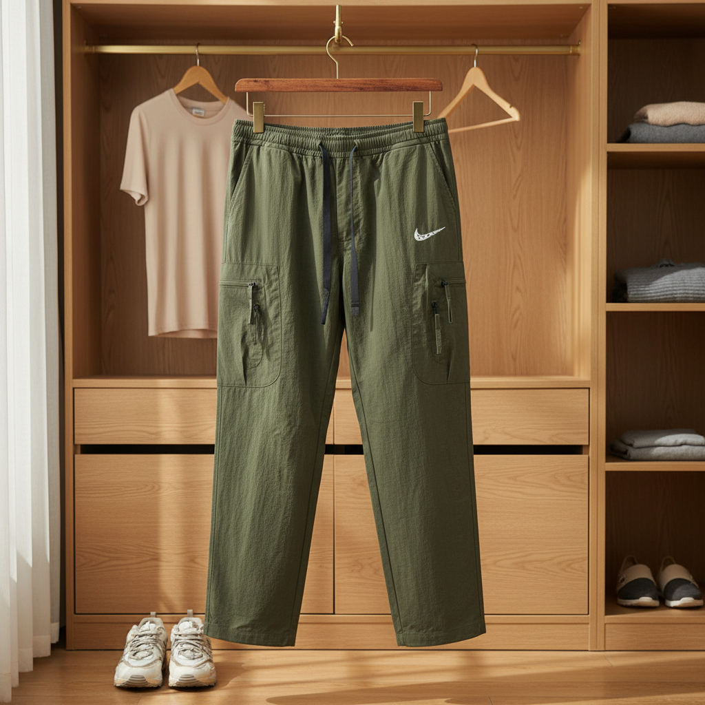 Nike Olive Green Cargo Pants feature lightweight breathable fabric, relaxed fit, multi-pocket design with zip side pocket, classic white logo, unisex streetwear for daily comfort and style.