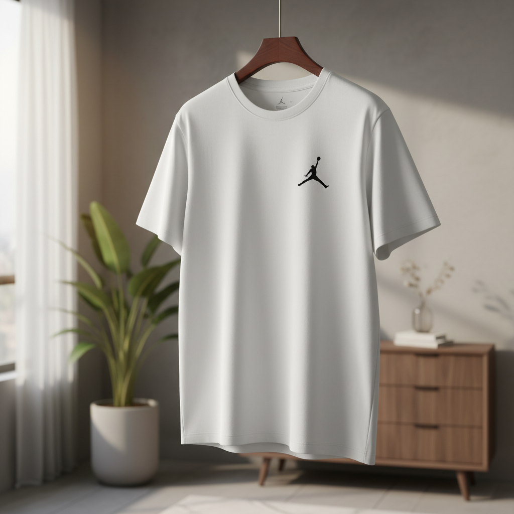 Nike Jordan White T-Shirt, premium breathable cotton, classic black Jumpman logo, unisex casual style, versatile and sporty for everyday fashion.