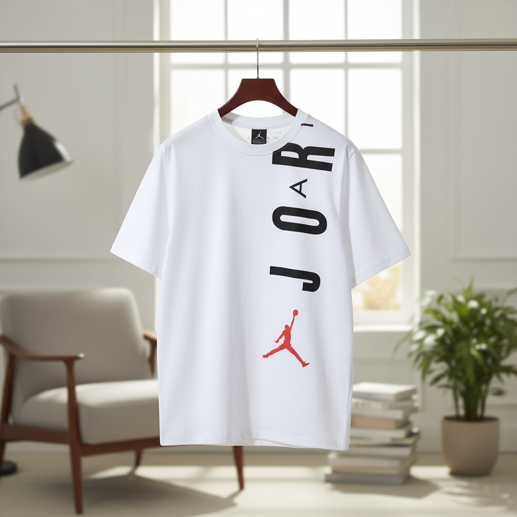 Nike Jordan Series White T-Shirt, made of breathable cotton, features bold vertical black JORDAN letters with red Jumpman logo, unisex streetwear style, perfect for daily casual fashion.