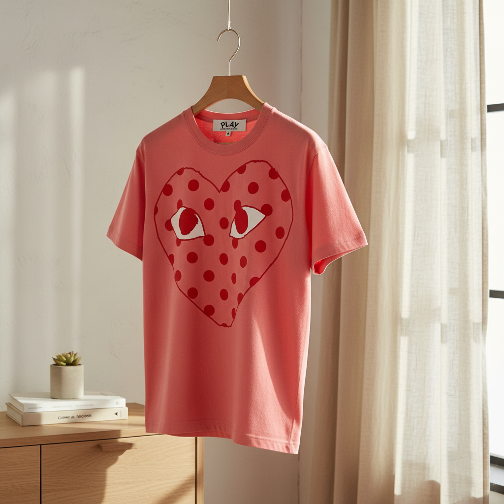Nike Comme des Garçons PLAY Pink T-Shirt, breathable cotton fabric, iconic red polka dot heart eyes print, classic crew neck, unisex style, street fashion, perfect for daily casual wear.