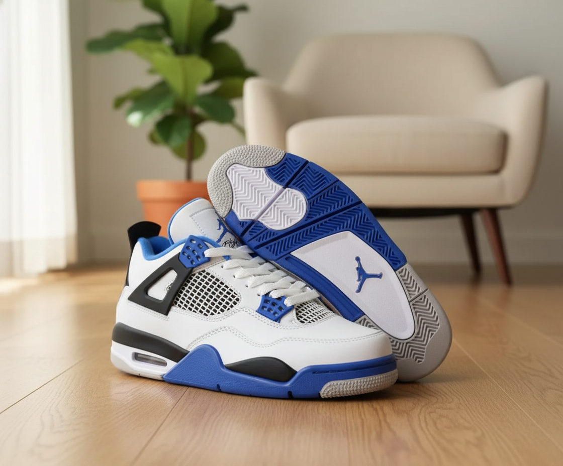 Nike Air Jordan 4 White Blue Black Basketball Shoes combine leather and mesh for breathable comfort, featuring Air cushioning, iconic Jumpman logo, and a classic sporty unisex design for style and performance.