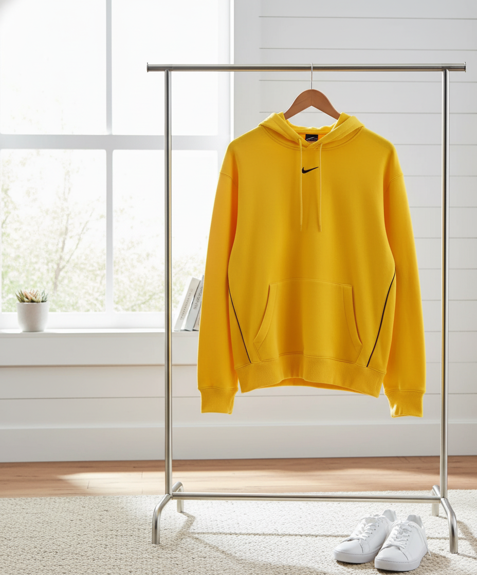 Nike Yellow Hoodie, made from soft breathable cotton with drawstring hood, black line sleeve details, and kangaroo pocket. Unisex streetwear for stylish everyday comfort.
