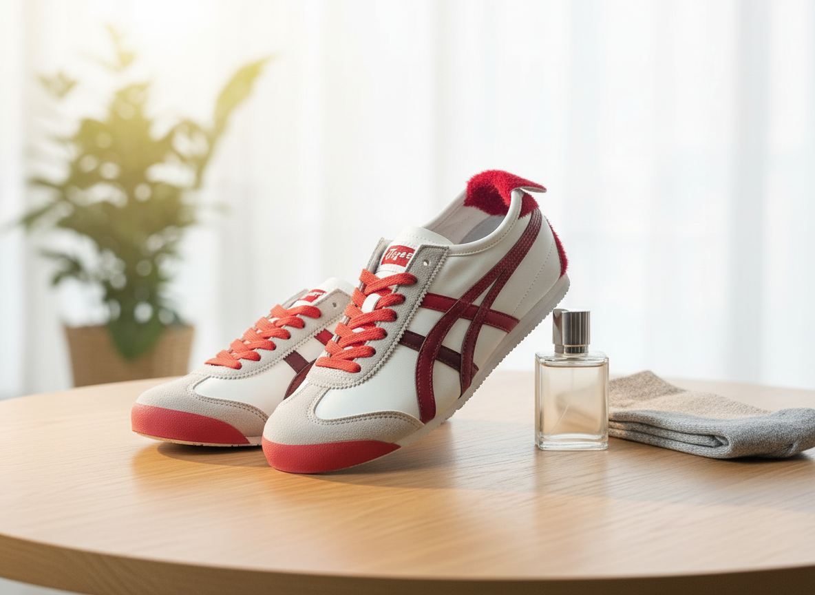 Onitsuka Tiger Mexico 66 White Red Sneakers – leather and suede mix, classic tiger stripe design, plush heel detail, retro sporty style, breathable comfort for men and women, ideal for daily wear.