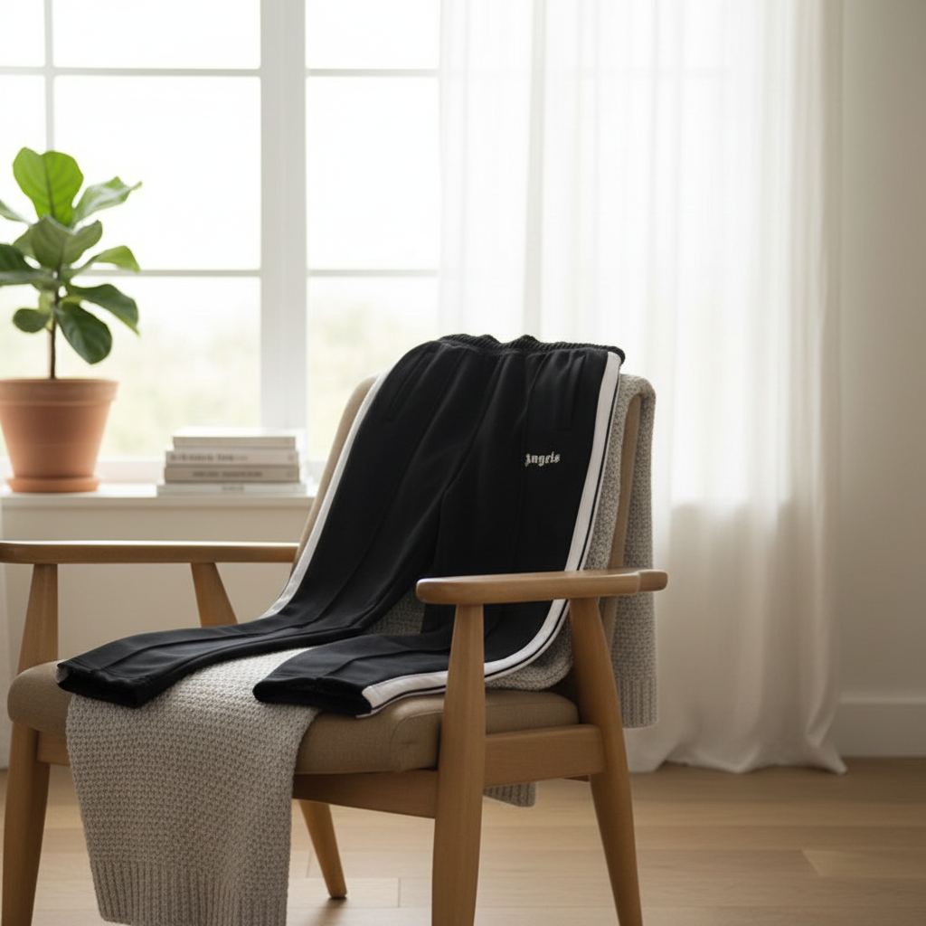 Palm Angels black track pants made from soft breathable cotton, featuring white side stripes, logo print, elastic waistband, practical pockets, unisex streetwear style for daily casual outfits.