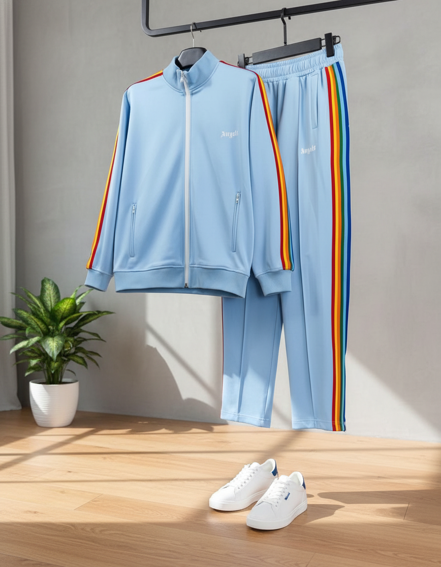 Palm Angels light blue tracksuit made from soft breathable fabric, features a stand-up zip collar, side rainbow stripes, “Angels” chest logo, unisex design, perfect for everyday street style comfort.