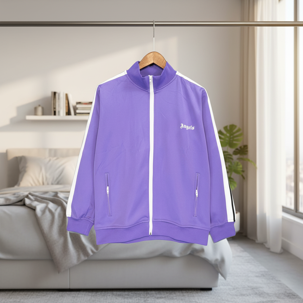 Palm Angels purple track jacket, made of breathable fabric with a stand collar and zip design, features side zip pockets, black-white sleeve stripes, and “Angels” logo for unisex streetwear style.