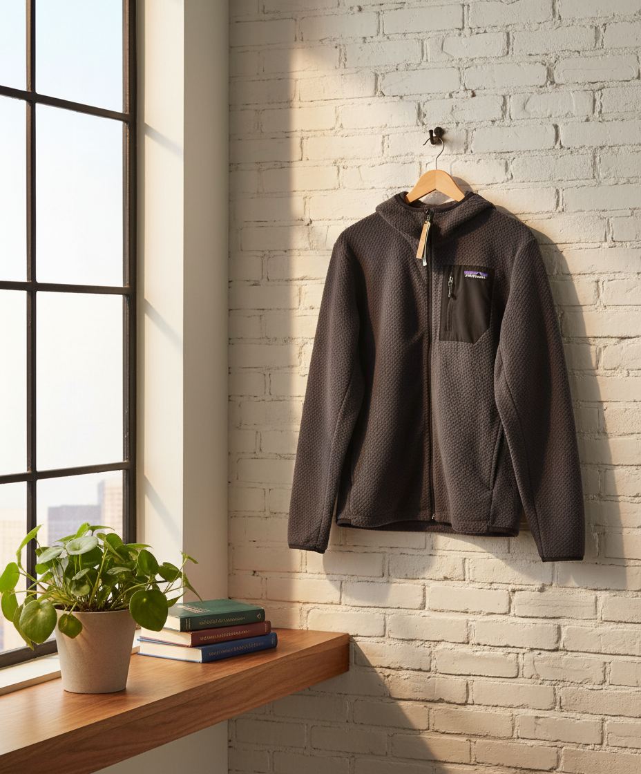 Patagonia Outdoor Series grey fleece hoodie with breathable warmth, zip front, chest pocket, unisex design for daily wear and light outdoor adventures.