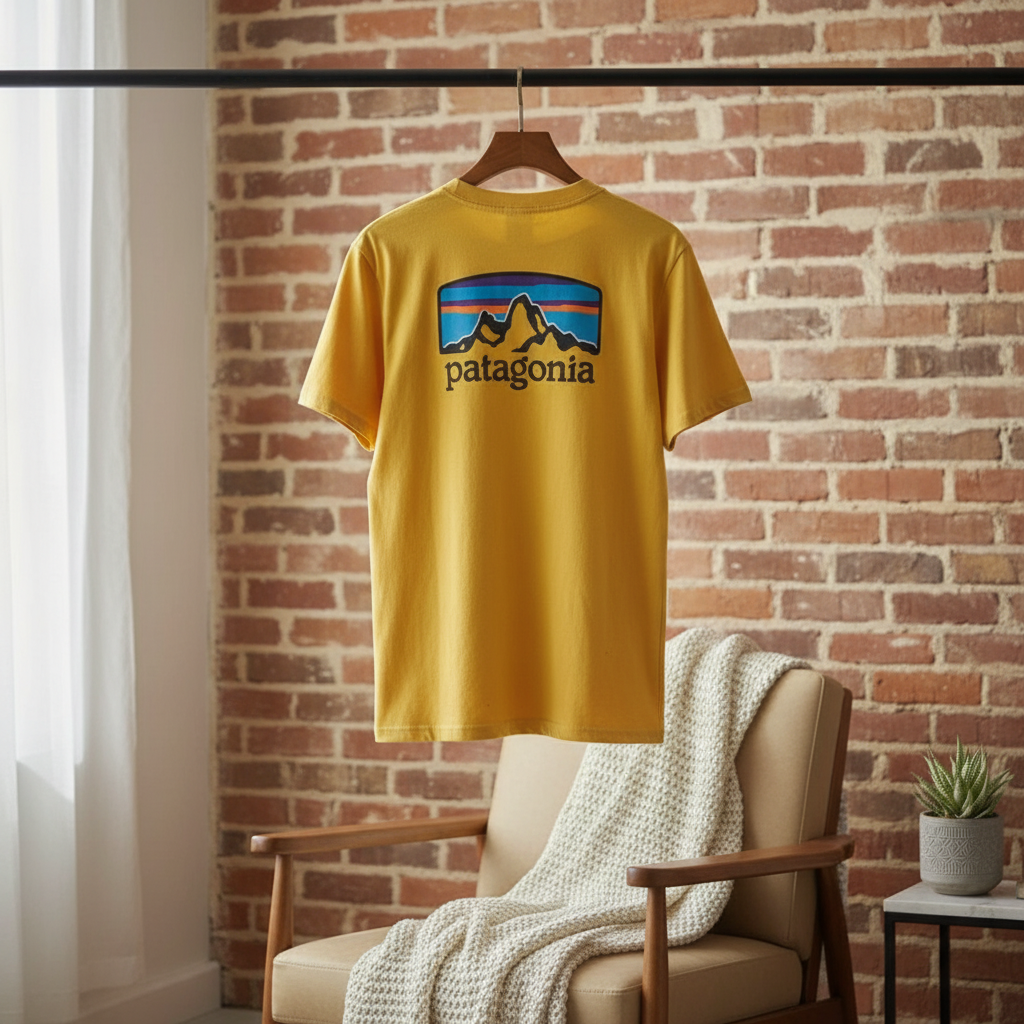 Patagonia Classic Outdoor Yellow T-Shirt, made from breathable cotton, features a bold mountain graphic print, unisex design, perfect for casual wear or outdoor adventures with natural spirit.