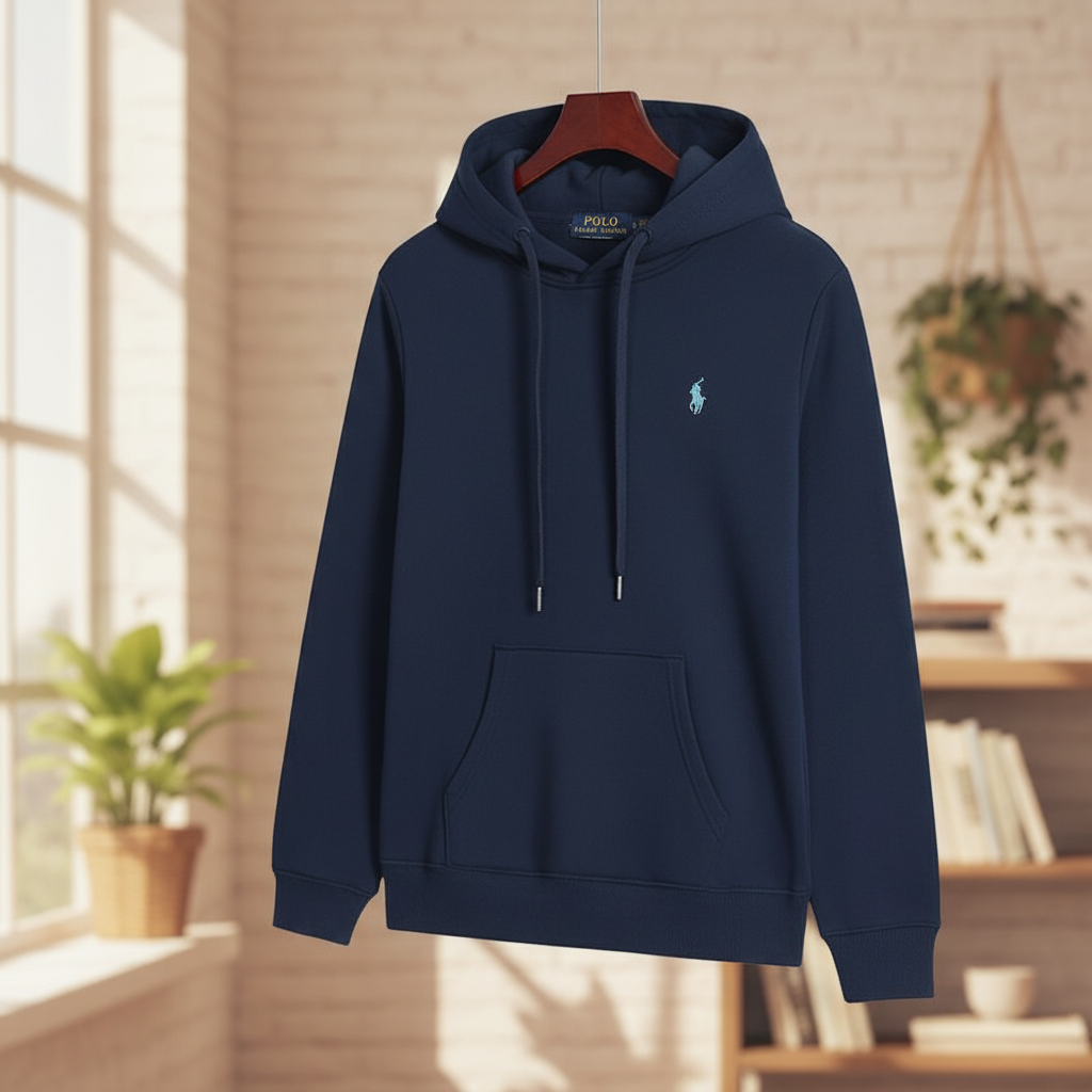 Ralph Lauren POLO Navy Hoodie – Soft breathable cotton, signature pony logo on chest, drawstring hood, practical kangaroo pocket, classic American casual style for men and women.