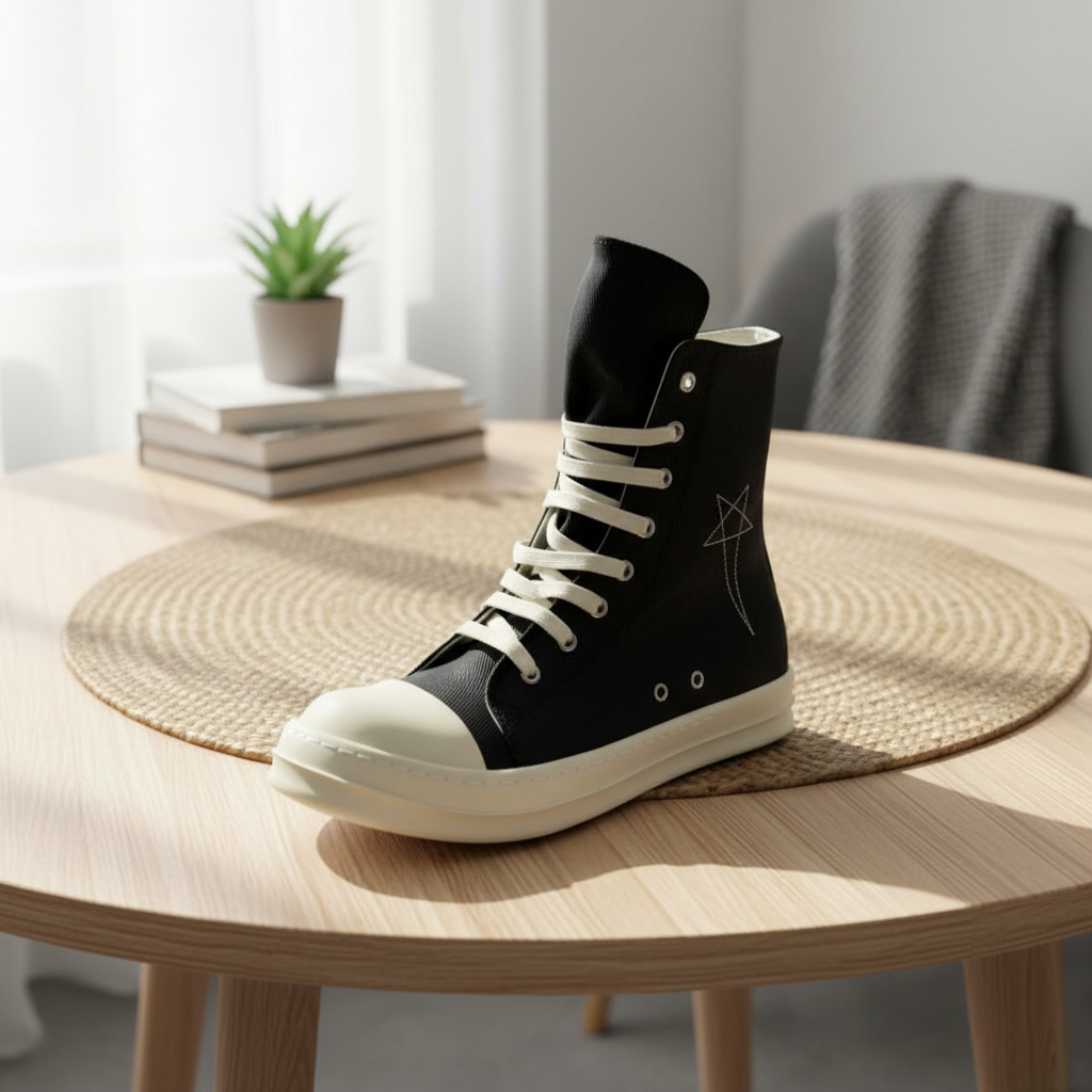 Rick Owens black high-top canvas sneakers with white star embroidery, chunky sole for height boost, lace-up fit, unisex design, showcasing bold dark avant-garde street fashion.