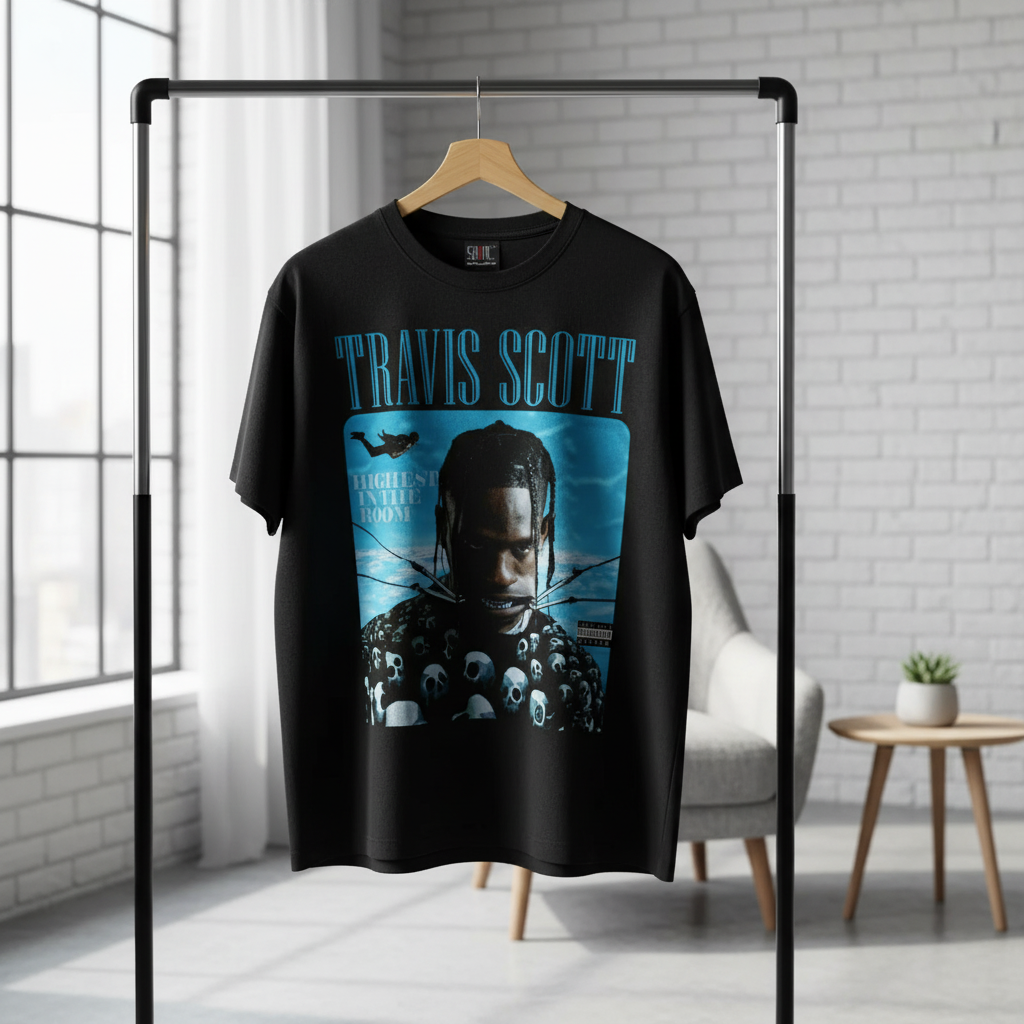 Saint Michael x Travis Scott black cotton T-shirt, soft breathable fabric, front graphic print with “HIGHEST IN THE ROOM” and skull design, streetwear unisex casual style, perfect for daily wear.