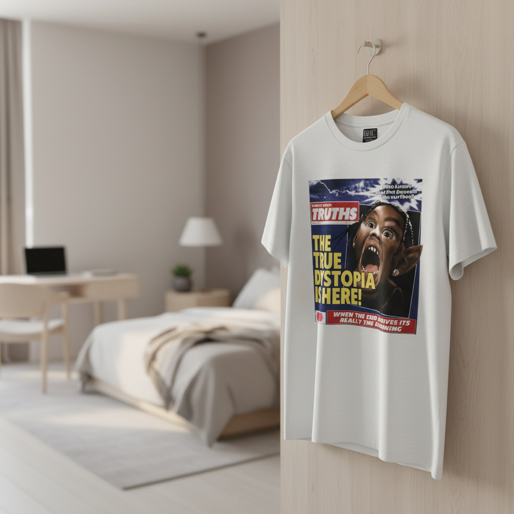 Saint Micheal white cotton short-sleeve T-shirt with newspaper-style graphic “THE TRUE DYSTOPIA IS HERE!”, streetwear vibe, breathable unisex design, perfect for casual daily outfits.