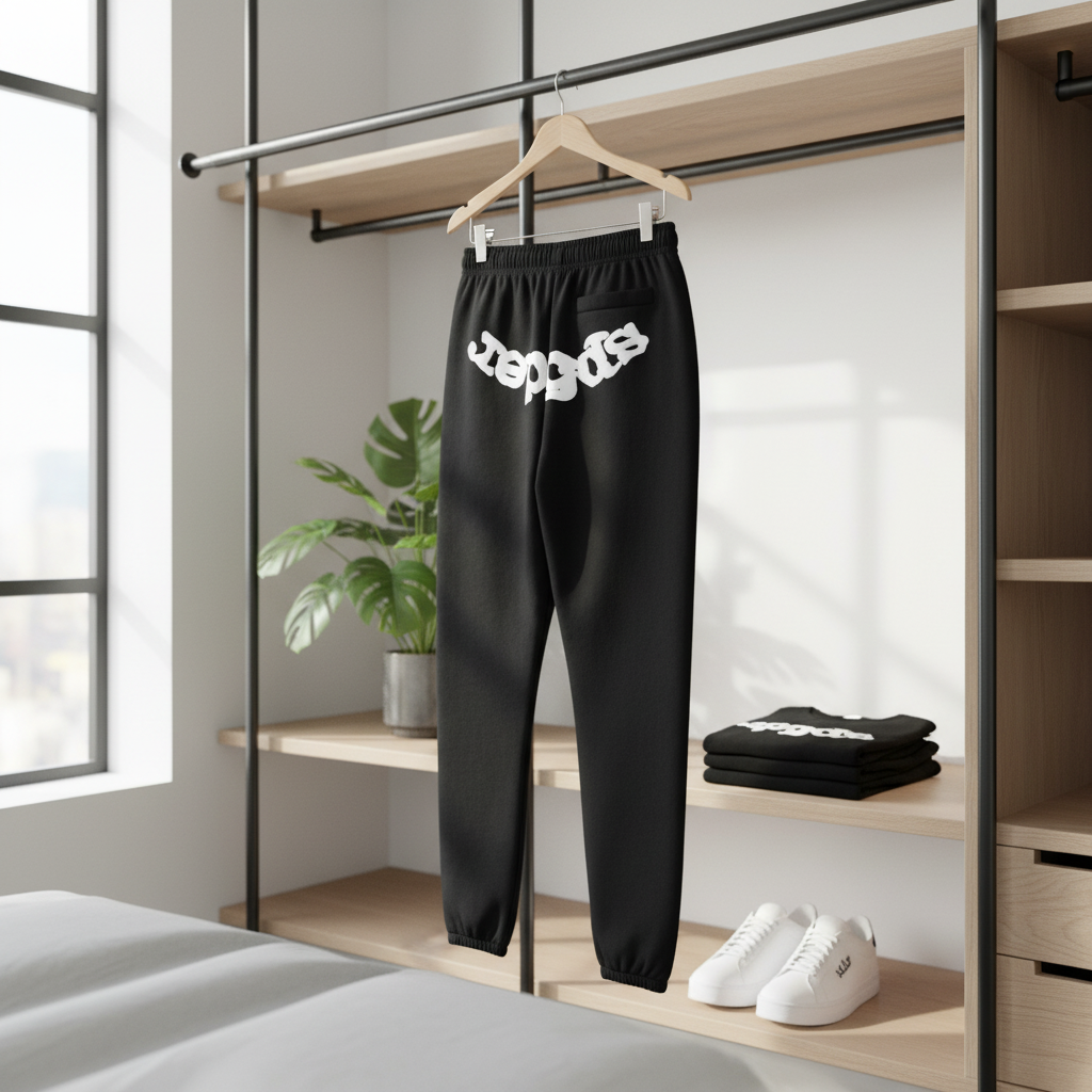Sp5der Black Casual Sweatpants, made from soft cotton fabric with an elastic waistband, feature bold 3D white logo design, unisex streetwear style, perfect for daily comfort and trendy looks.