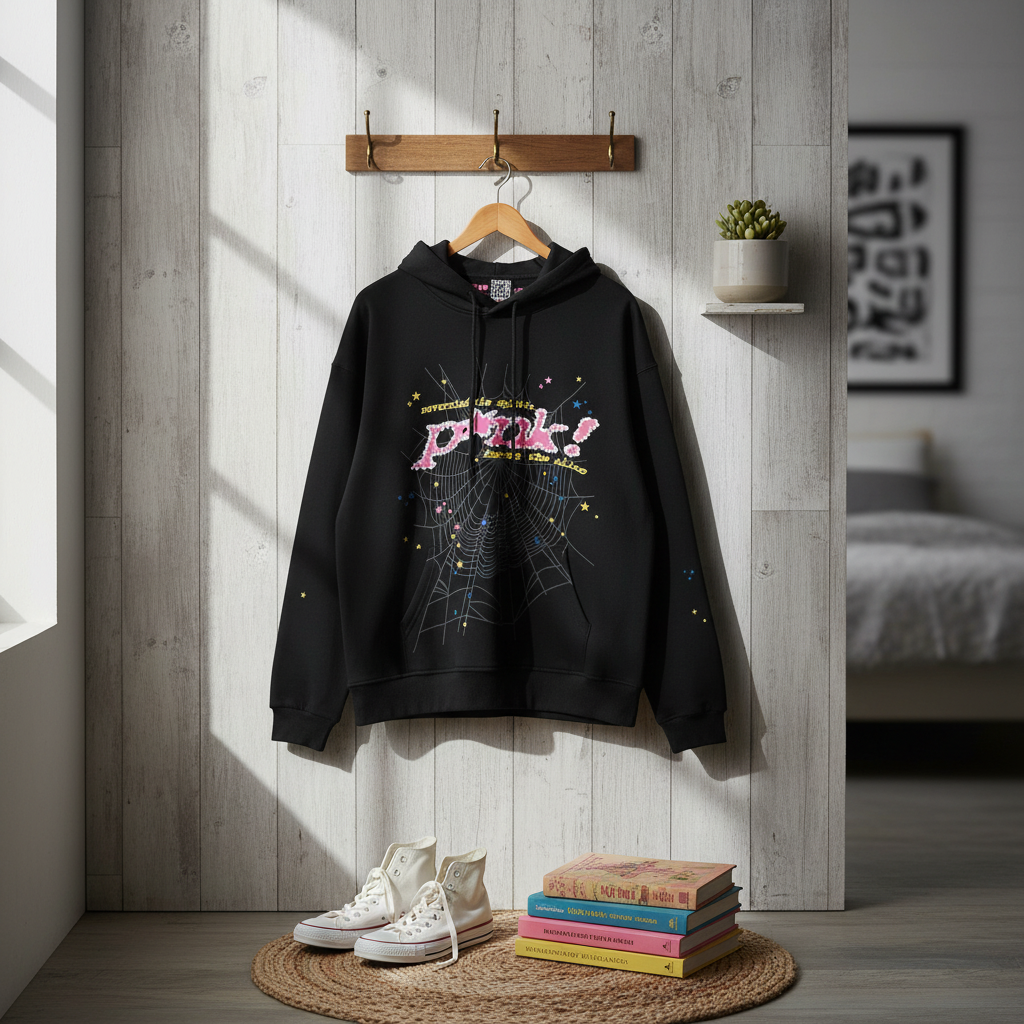 Sp5der Black Hoodie—crafted from soft, breathable cotton with a front spiderweb design, pink lettering, and colorful star prints. Features drawstring hood and kangaroo pocket. Unisex streetwear style.