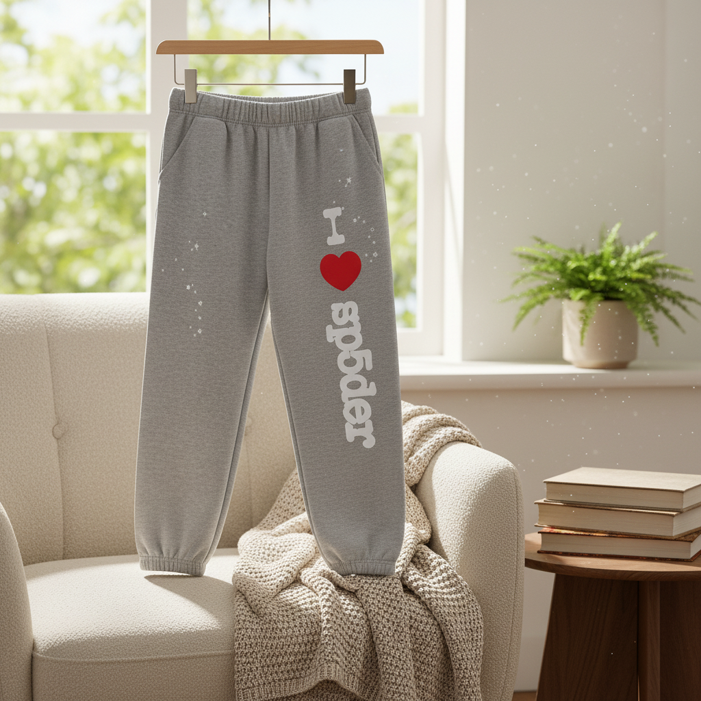 Sp5der Grey Sweatpants feature premium cotton fabric, soft and breathable feel, “I ❤️ Sp5der” and star prints, elastic waist for comfort, unisex design, perfect for street style and casual wear.