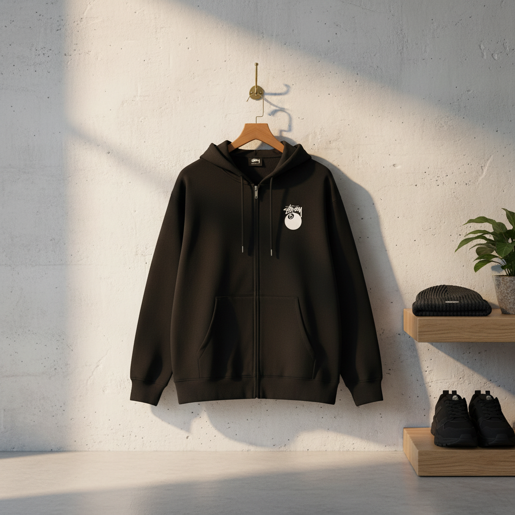 Stussy Black Zip Hoodie made from premium cotton, soft and comfy. Features front logo tag and iconic graffiti 8-ball graphic on back. Unisex streetwear style for everyday casual outfits.
