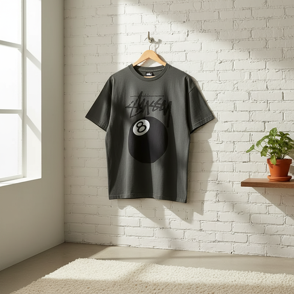 Stussy 8 Ball Series Dark Gray T-Shirt, breathable cotton fabric, signature logo and black 8-ball graphic on back, unisex streetwear style for daily casual fashion.