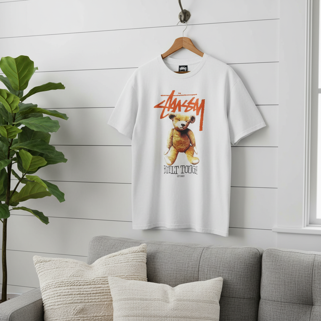 Stussy White Street Style T-Shirt, soft breathable cotton, orange graffiti logo, brown teddy bear print, “BUILT TOUGH ©1980”, unisex vintage look, perfect for casual daily wear.