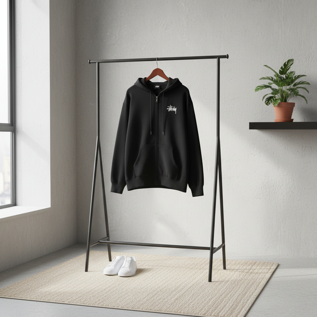 Stussy Black Zip-Up Hoodie – Soft cotton fabric, front logo, back graffiti design, streetwear style, unisex, perfect for daily casual outfits, trendy and comfortable.
