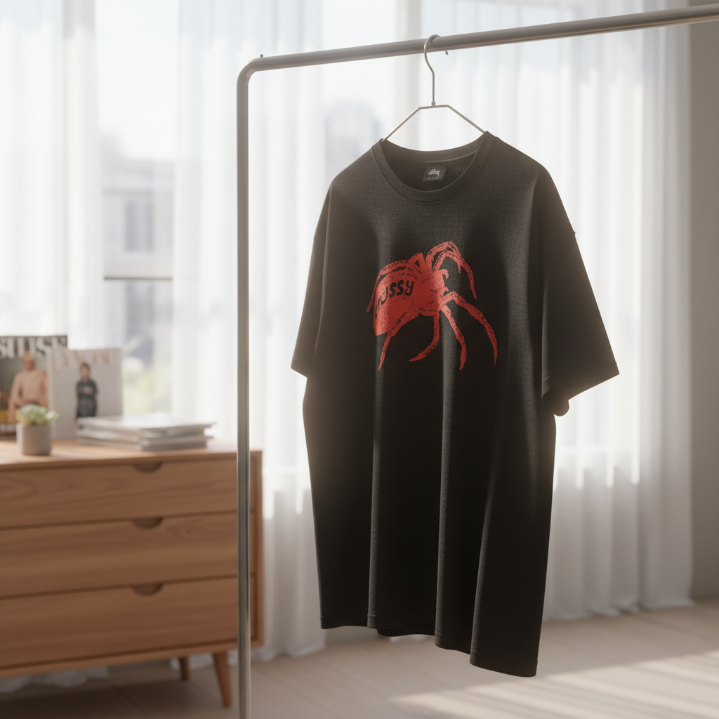 Stussy Black Cotton T-Shirt, featuring a bold red spider graphic and logo, loose crew neck design, breathable and comfortable streetwear style for men and women, showcasing unique urban fashion.