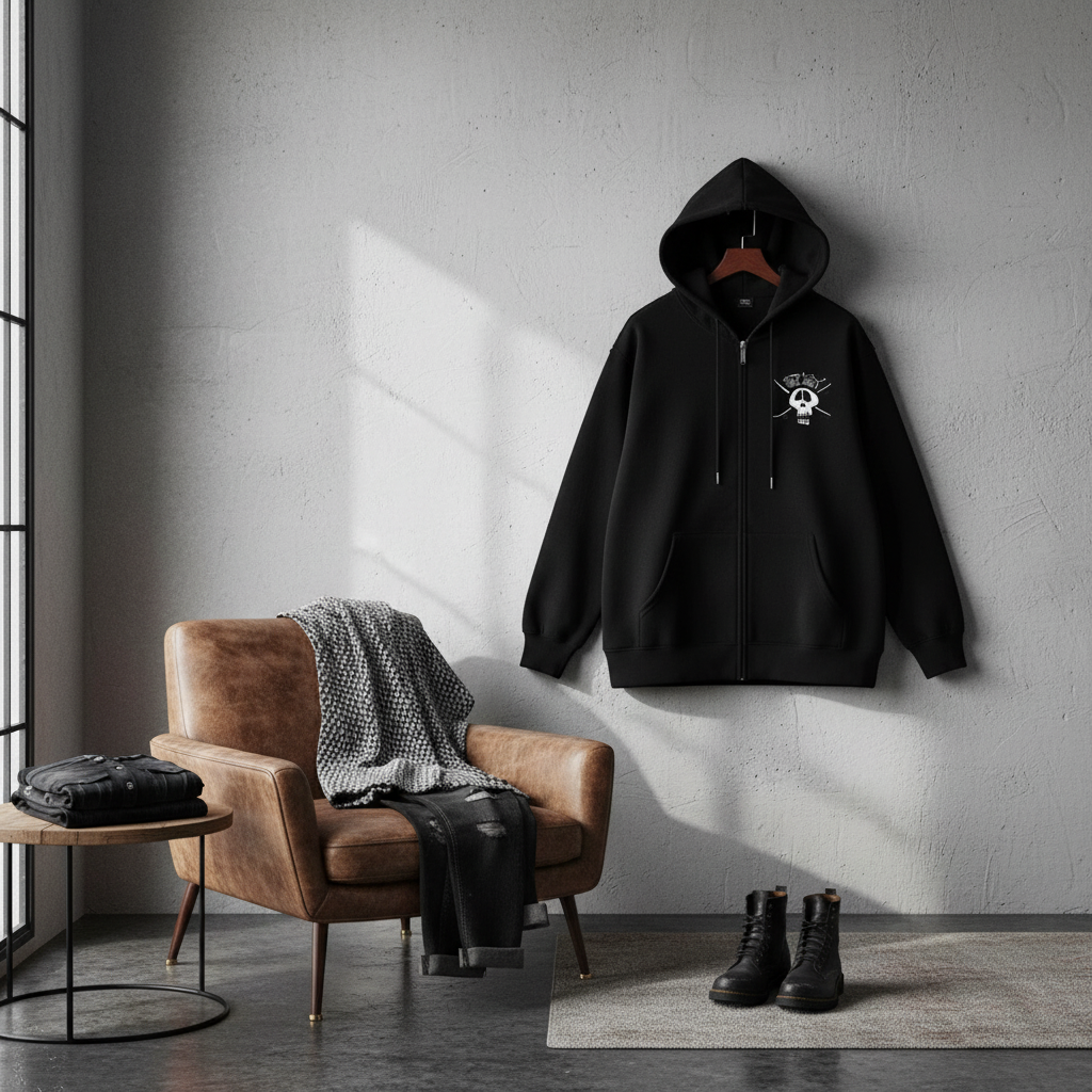 Stussy Black Zip Hoodie – soft breathable cotton, front mini skull emblem, bold back cross-skull graphic with logo, streetwear style, unisex, warm and comfy for everyday fashion attitude.