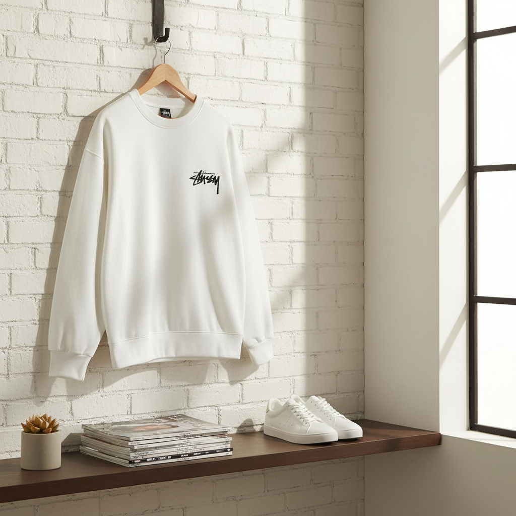 Stussy White Crewneck Sweatshirt, soft breathable cotton, front classic logo print, back black-and-white landscape graphic, unisex streetwear style, perfect for daily casual outfits.