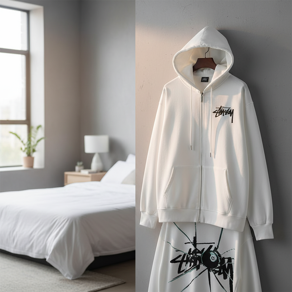 Stussy White Zip-Up Hoodie, soft breathable cotton, features classic chest logo and shattered glass graffiti back design. Unisex streetwear style for casual comfort and bold individuality.
