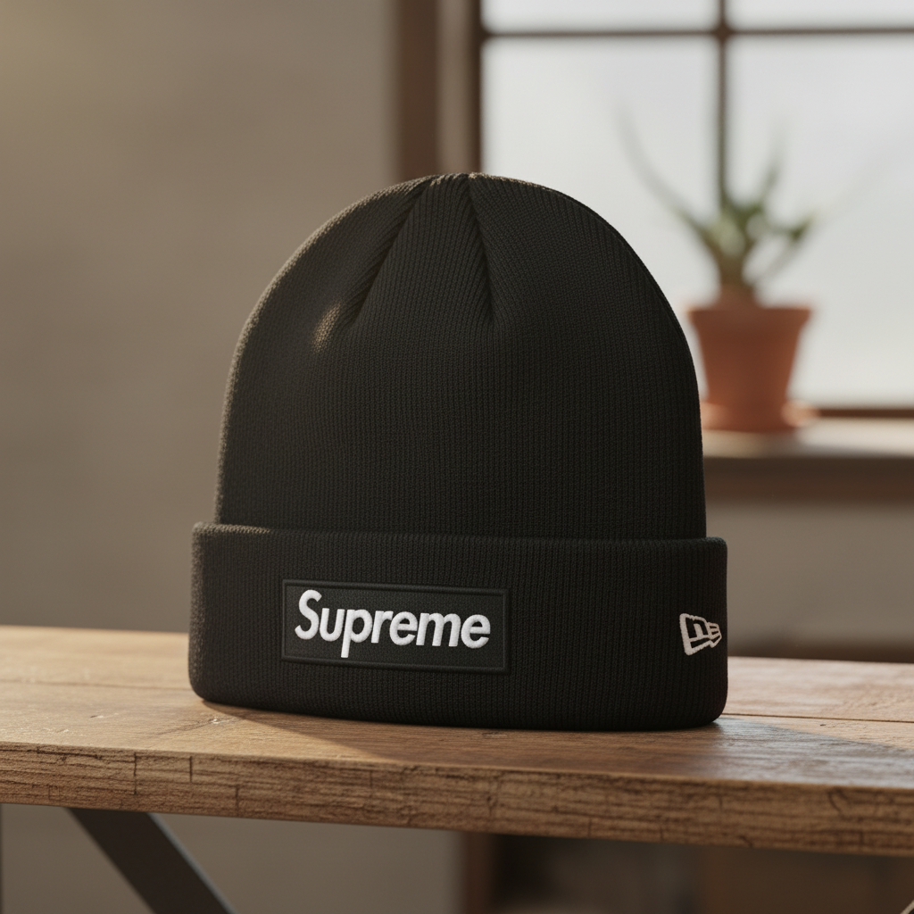 Supreme Black Knit Beanie – soft, warm and comfortable fabric with white embroidered Supreme logo, streetwear style, unisex, classic and versatile for everyday fashion and cold weather.