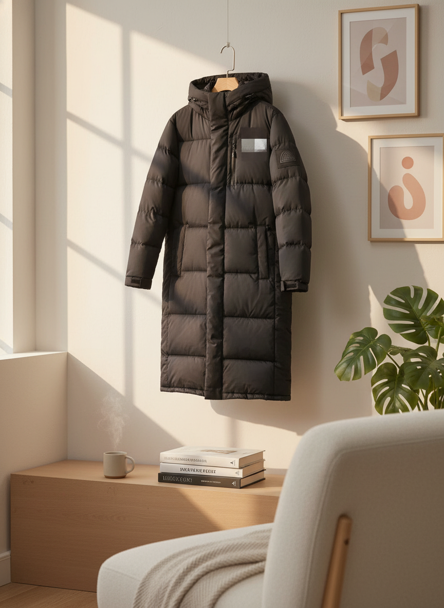 The North Face black long down jacket, windproof and warm fabric, quilted design for heat retention, hooded neck protection, easy zip closure, unisex outdoor style for fall and winter.