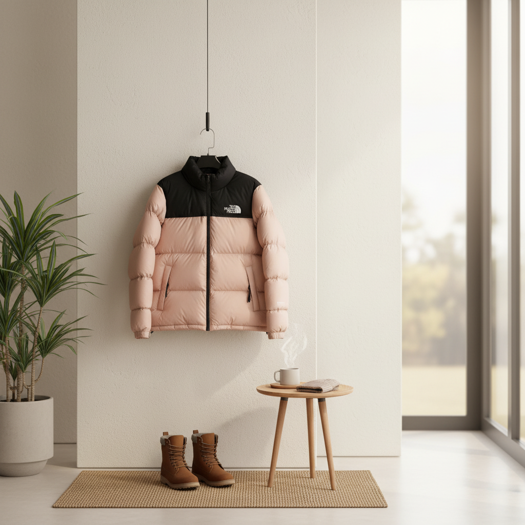 The North Face pink and black color-block down jacket, warm goose-down filling, stand collar with zipper, unisex outdoor casual style, classic logo design, stylish and practical for everyday wear.